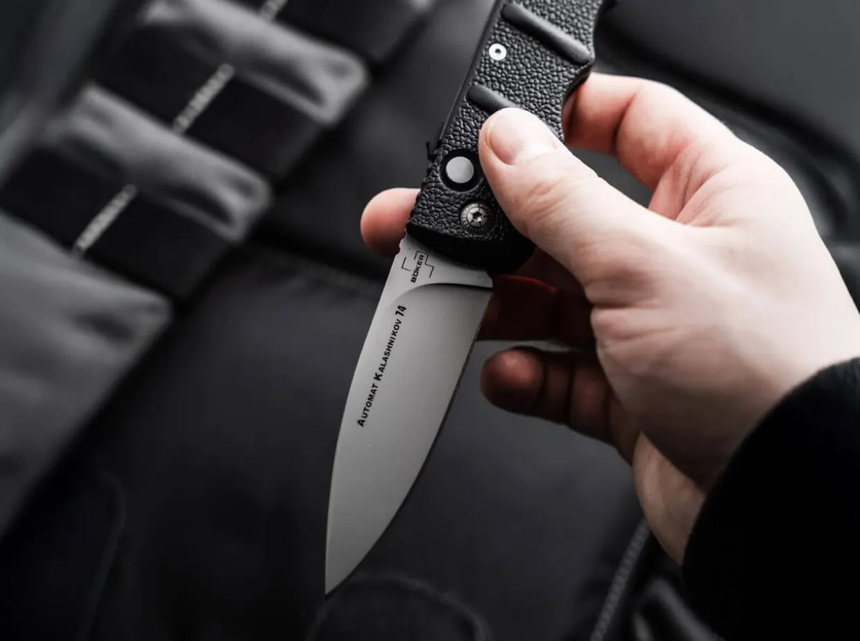 The Boker Plus Aks-74 From The Kalashnikov Series Is Certainly One Of The Most Popular Models In Our Range And Has Been Produced In Numerous Different Variants Over The Years. The Black Aluminium Handle Is Strongly Reminiscent Of The Bayonet Of The Famous Assault Rifle, And The Raised Textured Grooves Also Provide A Secure Grip In Any Situation. The Blasted Blade Is Made Of D2 Stainless Steel And Can Be Secured By Slide Lock In Addition To The Push Button. With A Lanyard Hole And A Practical Clip (Tip-Up/R).