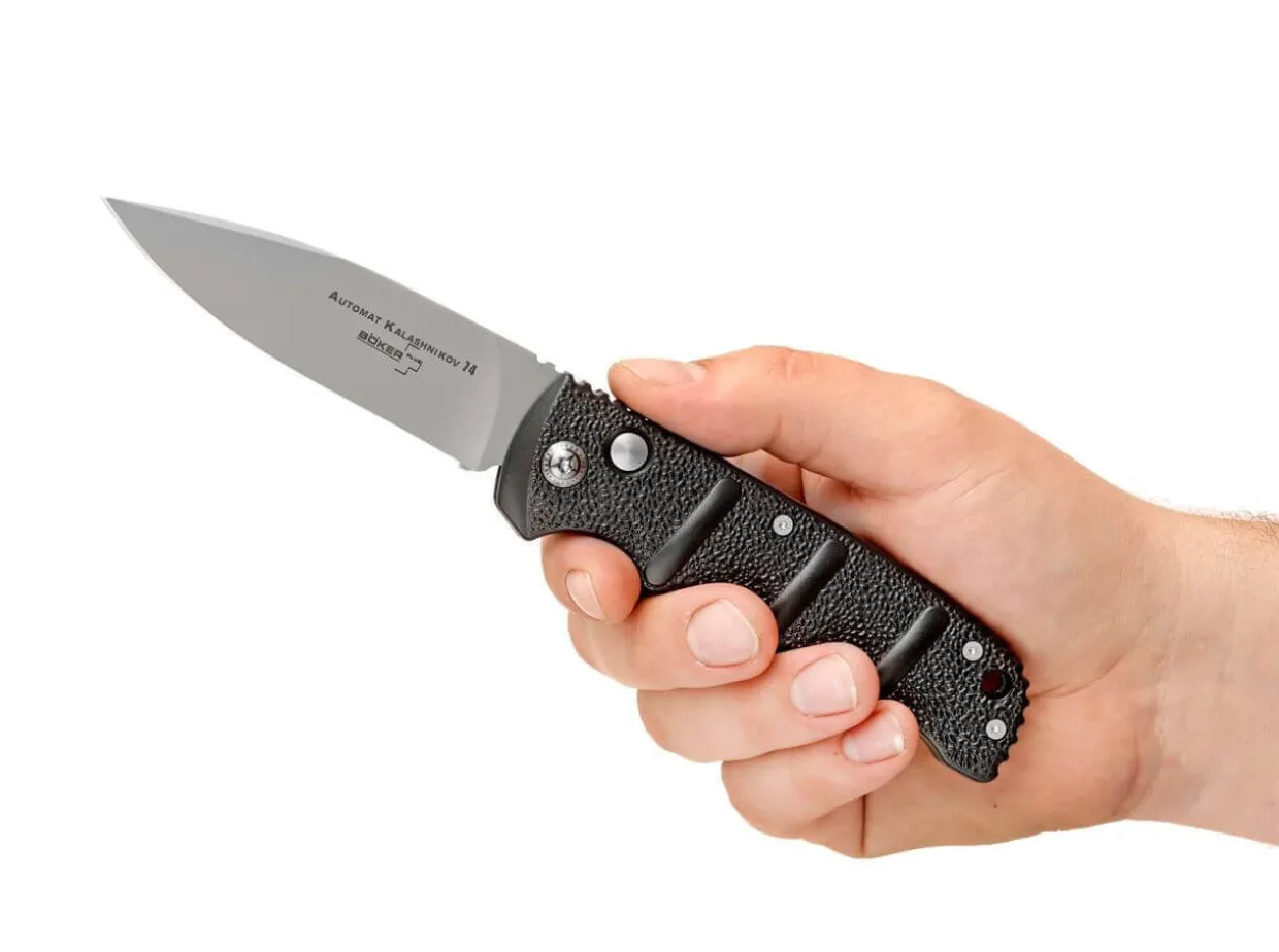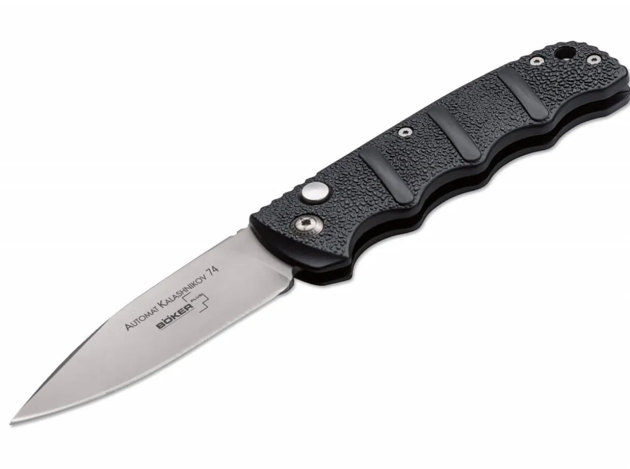 The Boker Plus Aks-74 Xl 42 Is The Enlarged Version Of The Popular Aks-74, But Unlike The Original Model, The Aus-8 Blade Does Not Open Automatically. The Solid Blade Is Opened Manually With The Second Hand And Locked With A Push Button. The Edp-Coated Black Aluminium Handle Is Reminiscent Of The Bayonet Of The Famous Assault Rifle And The Raised Structural Tracks Offer A Secure Grip In Every Situation. With Clip (Tip-Up).