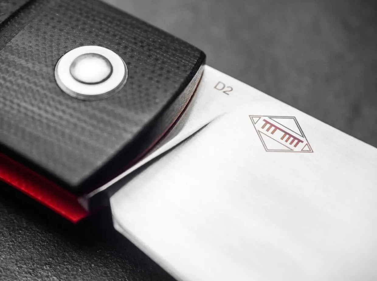 The Wide Clippoint Blade Is Made Of D2 And Is Provided With An Impressive Hairline Finish And A Distinctive Ricasso. The Knife Is Opened By Nail Nick And Does Not Lock. The Exceptional G10 Handle Scales Have A Coarse Texturing Reminiscent Of A Rustic Forged Skin. Indicated Bolsters, Red Fibre Layers Of G10 And A Stylised Skull Emblem On The Front Underline The Provocative Character Of The Knife. Supplied With Lanyard Hole And High-Quality Nylon Sheath For Storage.