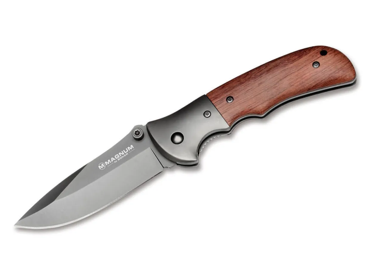 The Magnum Co-Operator Is A Reliable Everyday Knife. Large Enough To Tackle Heavier Work, Yet Small Enough To Carry Comfortably. The 440A Stainless Steel Blade Is Engaged By A Linerlock. The Heavy Stainless Steel Bolsters Feature A Charcoal Coating, As Does The Blade. The Grip Has A Warm Red-Brown Hew And Is Made From Genuine Huali Wood. With Lanyard Hole And Clip.