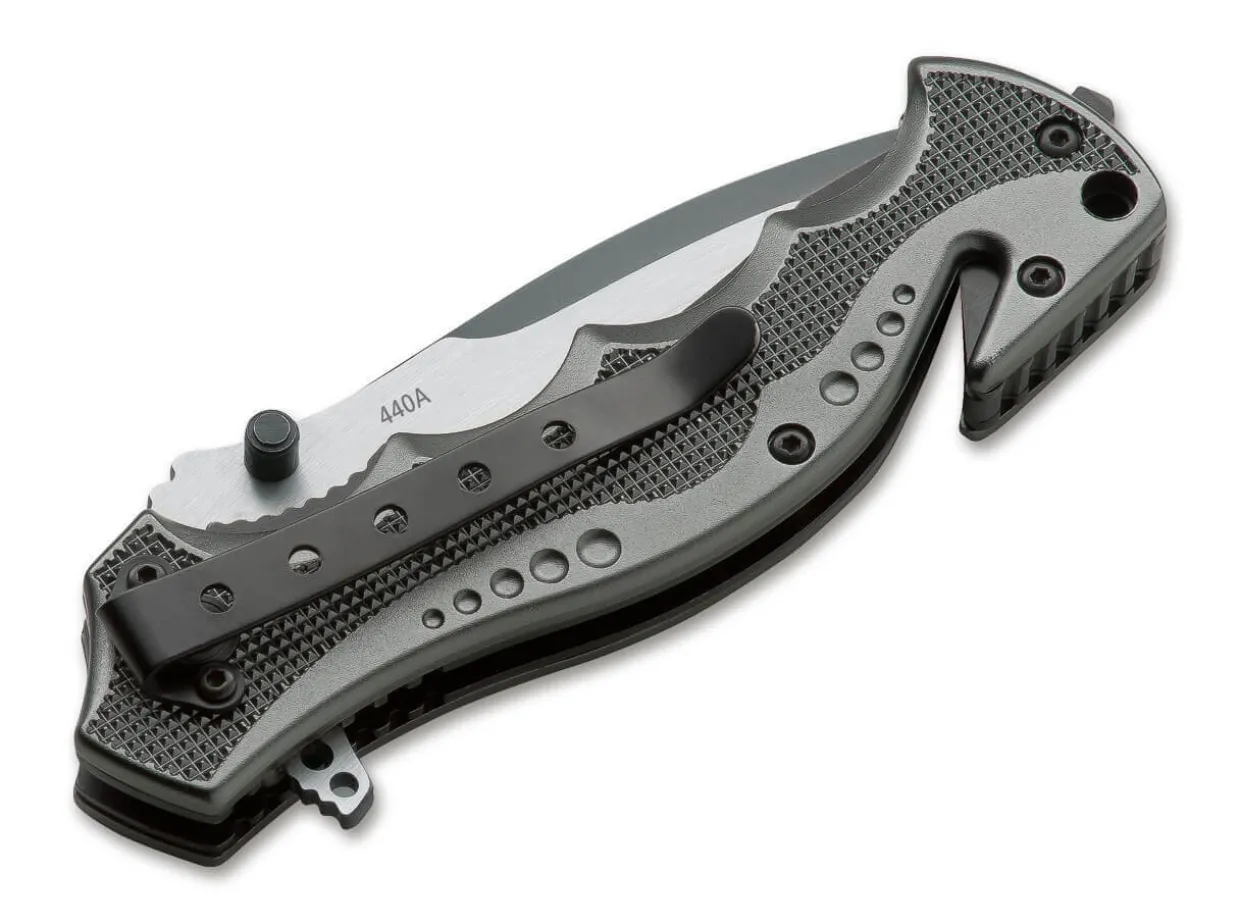 Das Magnum Hero Spiegelt Den Mut Und Die Professionalitat Der Spezialisten Wider, Die Bei Gefahrlichen Polizeieinsatzen Ihr Leben Aufs Spiel Setzen. Die Rostfreie Klinge Aus 440A Ist Mit Einem Attraktiven Two-Tone-Finish Versehen Und Arretiert Uber Den Linerlock. Der Anthrazitfarbene Griff Ist Mit Swat-Logo Versehen Und Besteht Aus Leichtigewichtigem, Stabilen Aluminium. Der Glasbrecher, Der Partielle Wellenschliff, Der Gurtschneider Und Der Federunterstutze Offnungsmechanismus Stehen Fur Eine Hohe Funktionalitat. Mit Clip Und Fangriemenose.
