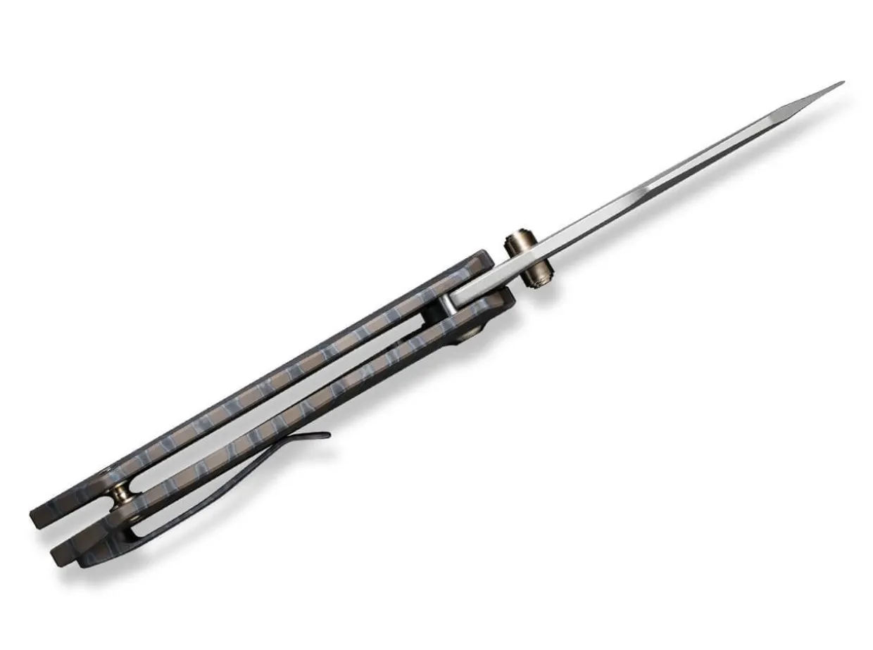 Complete And Strikingly Unique, The We Knife High-Fin Stands Out From The Crowd And Impresses With Its Angular Design And High-Quality Materials. The Blade Made Of Powder Metallurgy Cpm-20Cv With Grey Stonewash Finish Is A Mixture Of Reverse-Tanto And Harpoon And Is Reminiscent Of The Raised Dorsal Fins Of Various Fish Species. The Knife Glides Through Daily Cutting Tasks As Precisely As A Fish Through Water. The Dynamic Handle Made Of Gray Titanium With Tiger Stripe Pattern Lies Securely In The Hand At All Times And Houses The Reliable Frame Lock. The Gold-Colored Screws Provide A Successful Accent. With Tip-Up(R) Clip.