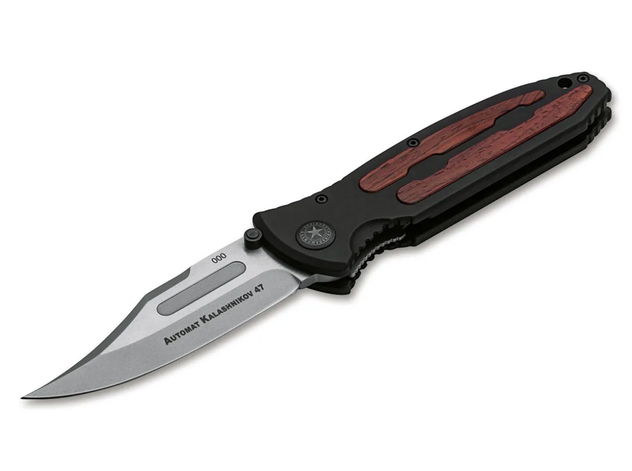 The Boker Kalashnikov Duty Strips Away All Non-Essential Special Equipment, Focusing Entirely On Function And Reliability In The Tradition Of Mikhail Kalashnikov’S Design Approach. The Typical Bayonet Blade Of The Tactical Knife Was Purposely Made From 440C, Tried And Tested For Decades, Which Was Finely Sandblasted And Received A Two-Tone Finish. The Blade Is Opened With A Thumbstud And Secured With A Sturdy Linerlock. The Handle Was Cnc-Milled From A Solid Block Of 6061-T6 Aluminum And Then Hardcoat-Anodized In Black. The Handle Is Inlaid By Hand With Certified Imported Cocobolo And Also Cnc-Milled From Solid Wood. All Screws And The Clip (Tip-Up) Are Also Anodized In Black.