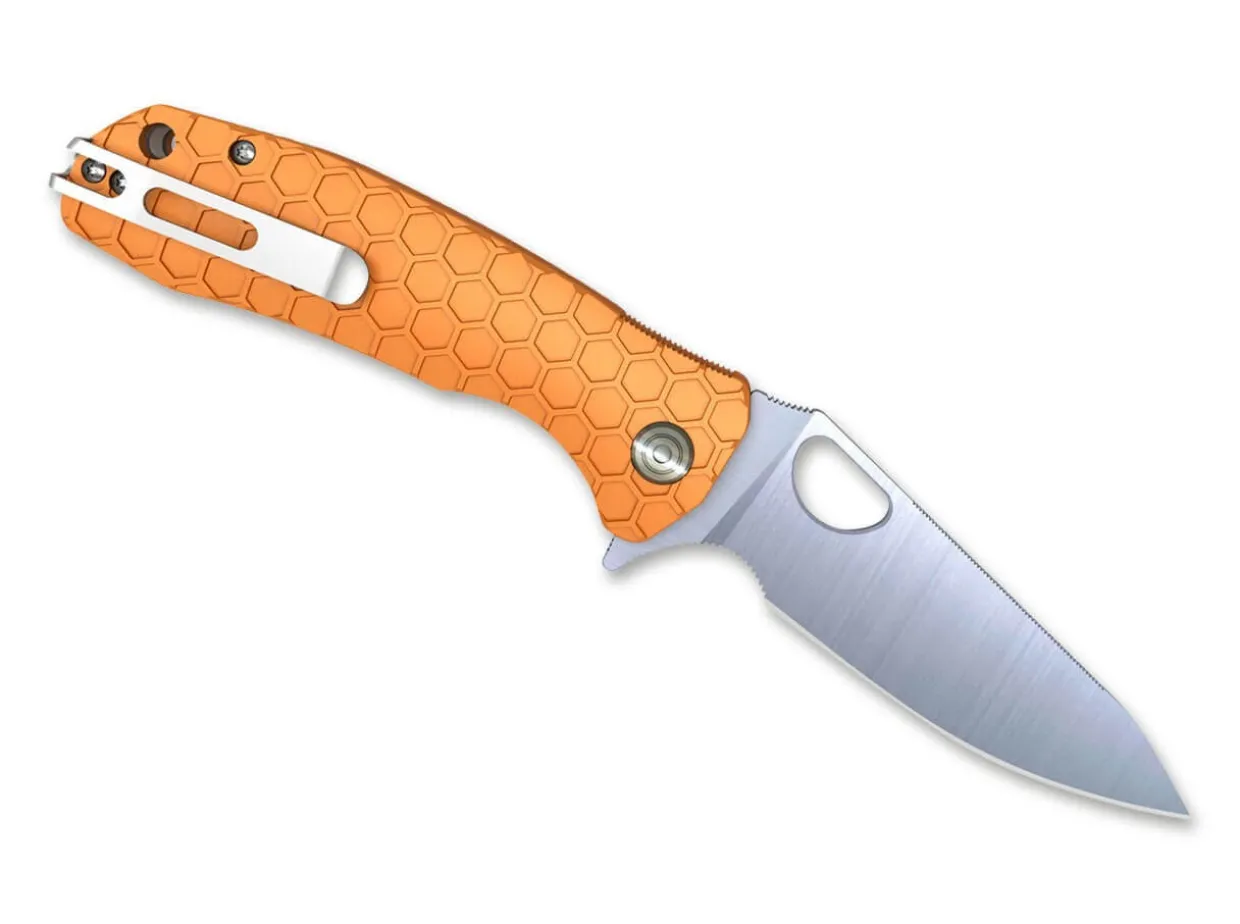 The Fully-Grown Honey Badger Leaf Large Orange Picks Up The Dna Of The Manufacturer And Equips The Folder With A Cut-Resistant Blade Made Of 8Cr13Mov And The Typical Handle With A Honeycomb Structure. The Knife Can Be Opened Either With A Flipper Or The Generous Thumb Hole. The Blade Is Secured By The Sturdy Linerlock. With A Lanyard Hole And A Convertible Clip (Tip-Up/L+R).