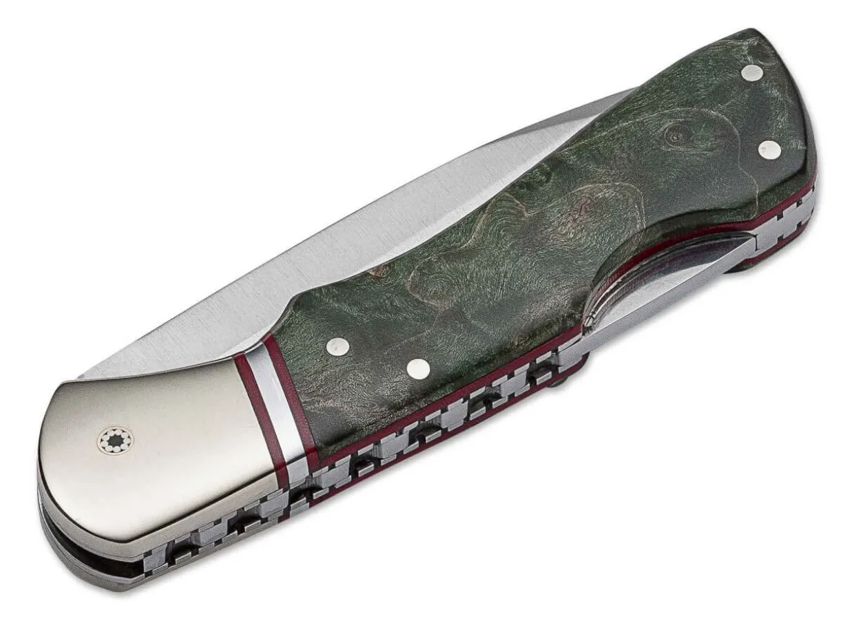 Der Aufwandig Gearbeitete Griff Des Maderas Anniversary Besitzt Eine Beschalung Aus Stabilisiertem Ahorn-Wurzelholz, Das Mit Roten Fiberlagen Unterlegt Ist. Als Besonderen Akzent Verbaut Muela Zwischen Beschalung Und Neusilberbacke Noch Ein Poliertes Distanzstuck, Das Ebenfalls Beidseitig Von Roter Fiber Eingefasst Ist. Sowohl Die Ruckenfeder Wie Auch Die Edelstahlplatinen Sind Mit Dekorativem Filework Versehen, Das Sich Bis Zum Griffende Fortsetzt. Die Vernietung Der Klingenachse Erfolgt Mit Einem Mosaikpin, Eine Absolute Seltenheit Bei Einem Messer Dieser Bauart. Die Satinierte Klinge Aus 4116-Stahl Wird Per Lockback Verriegelt. Auf Der Neusilberbacke Ist Die Individuelle Seriennummer Aufgebracht. Limitiert Auf 999 Exemplare Weltweit.