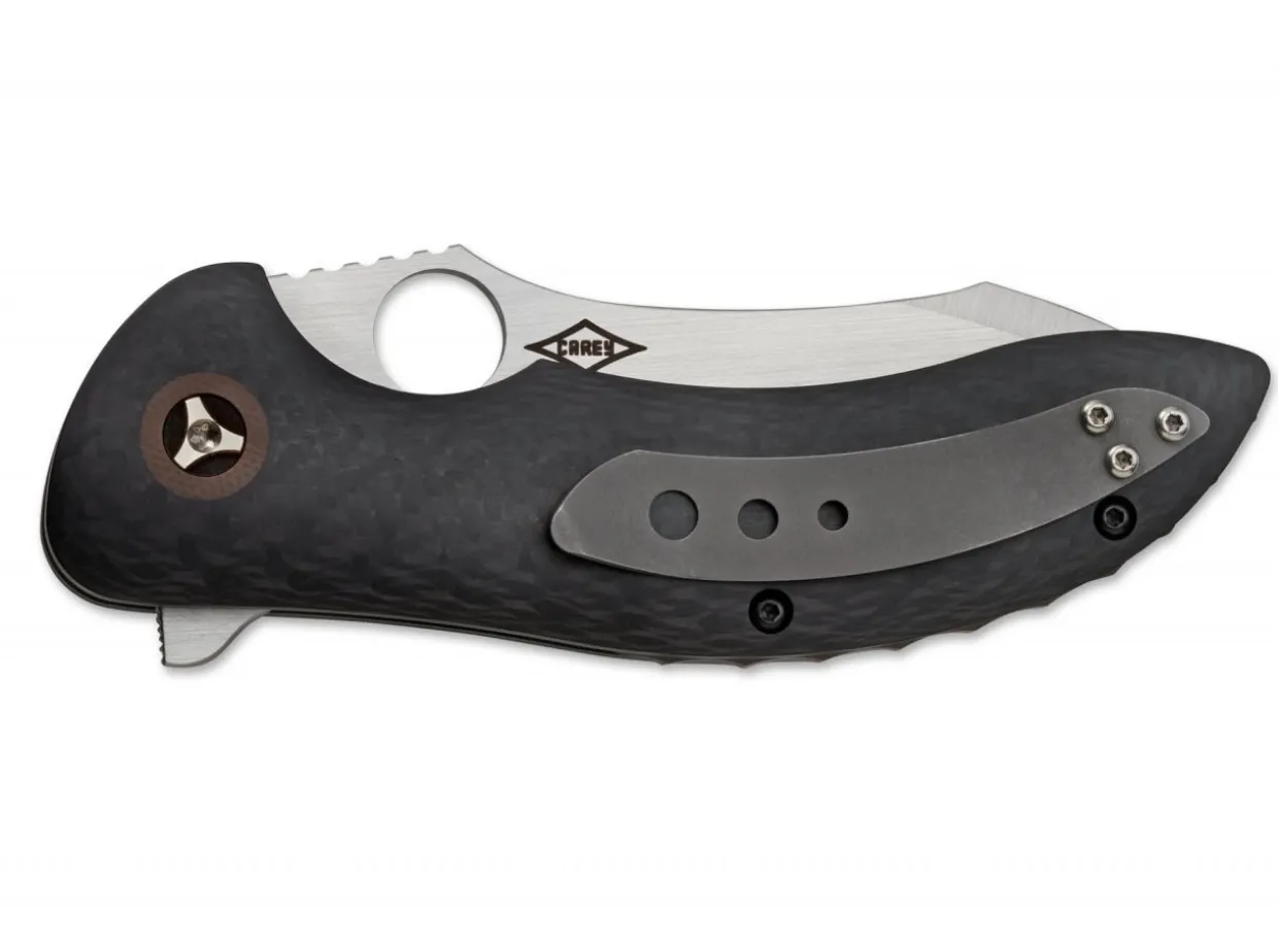 The Features On This Custom Design By Peter Carey Were Executed With Extraordinary Attention To Detail. Perforated Titanium Liners Carry The 3D-Contoured Handle Scales Made From Twill/Carbon Fiber. The Ball Bearing Hinged Blade Is Fabricated From Powdered Metal Cpm-S30V And Is Deployed With The Flipper Or The Thumb Hole. The Special Blade Joint Is Enclosed By A Brown G10 Inlay That Matches The Ribbed Spacer In The Handle Spine, Which Is Also Fabricated From Brown G10 And Features An Arc-Shaped Structure. The Distinctive Blade Grind Completes The Highly Expressive Design Into An Entirely Unique Work Of Art. Liner Lock, Removable Clip (Tip-Up).