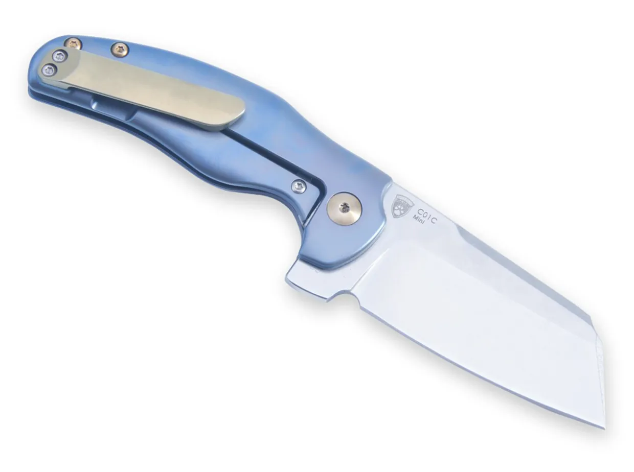 The Compact Version Of The Sheepdog Has A Hefty Sheepsfoot Blade Made From Powder-Metallurgical S35Vn. The Titanium Framelock Firmly Secures The Blade On Ball Bearings. The Blue Anodized Handle Is Finished With Gold Anodized Hardware (Screws And Clip). With A Clip (Tip-Up/R).