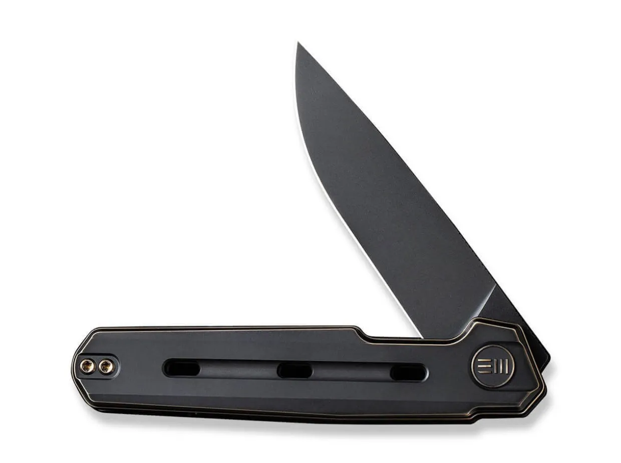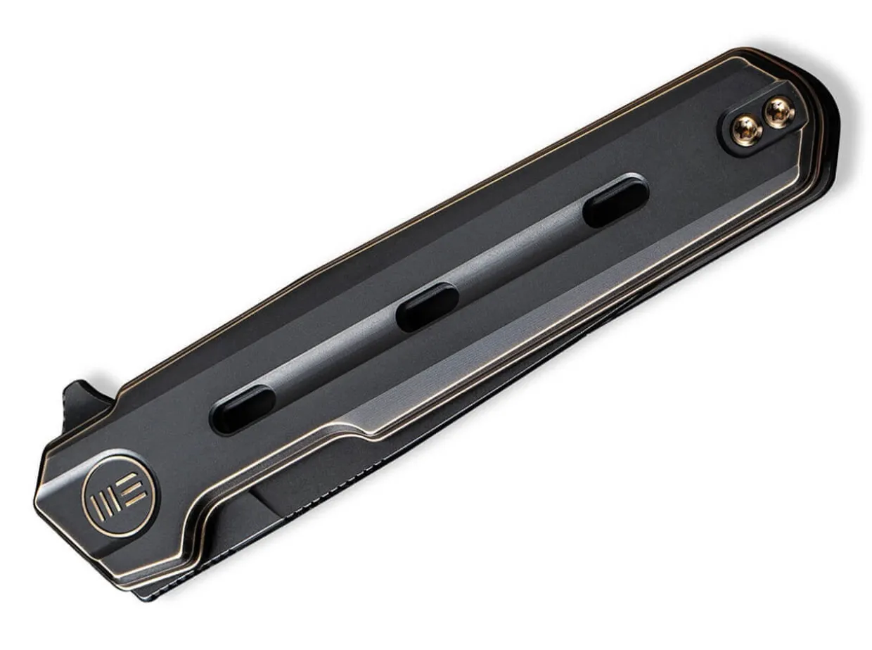 Discretion And Restraint Take A Back Seat To The We Knife Navo, Emphasizing Above All High Functionality, Eye-Catching Design And A Reduction To The Essentials. Ostap Hel Uses The Proven, Powder-Metallurgical Cpm-20Cv Steel For His Design And Gives The Ball-Bearing Droppoint Blade A Smoky Black Stonewash Finish. The Gentleman’S Knife Is Opened By A Flipper, While The Solid Liner Lock Reliably Secures The Blade. The Decorative Apertures In The Black Titanium Handle With Gold-Colored Contour Are Striking, Both Increasing The Grip And Reducing The Weight. The Self-Confident Appearance Is Rounded Off By The Backspacer And Tip-Up Clip (R) Made Of Titanium As Well As The Gold-Colored Screws.
