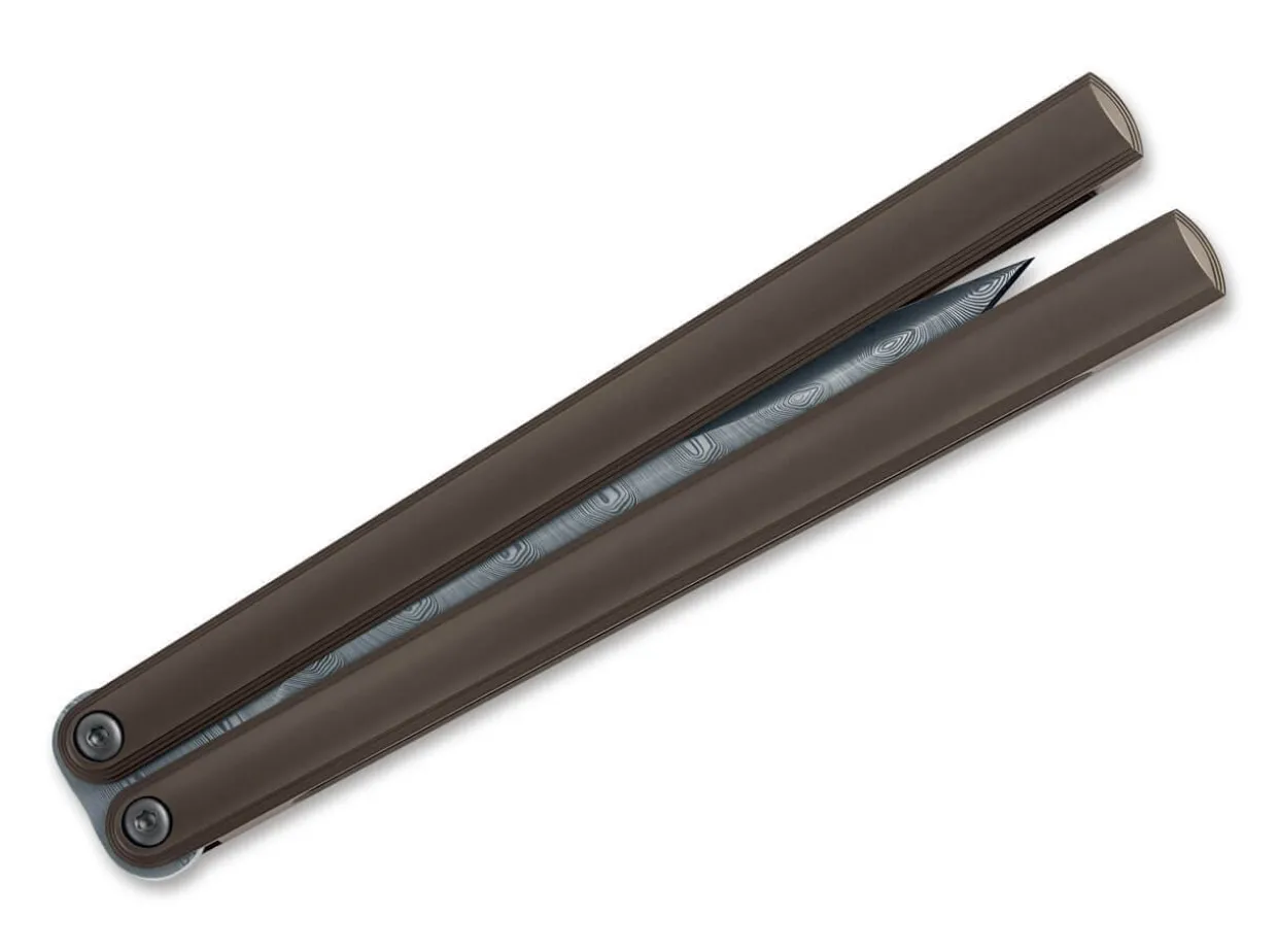 The Fox Phi Takes Up The Roots Of The Filipino Balisong Knives And Receives A Modern Interpretation By Designer Vincenzo Fiore. Typical Of These Knives, Also Called “Butterfly“, Are The 180° Pivoting Handle Halves, Which In The Case Of The Fox Phi Are Made Of Bronze-Colored Titanium In The Sense Of A Balanced Weight Distribution And Do Not Have The Usual Circular Recesses. The Absence Of The Usual Safety Pin At The End Of The Handle Also Ensures A Tidy Image, Making The Knife Elegantly Slim. For The Blade, The Phi Relies On The Noble Super Dense Twist Damascus From Damasteel, Which Promises Extreme Reliability When Cutting Thanks To High Wear Resistance And Toughness.
