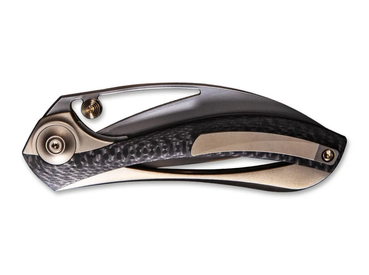 This Extravagant Design By Elijah Isham Is Fascinating In Its Innovative Shapes And Lines. The Curved Handle Consists Of Titanium And Carbon Fiber, Secured With The Inserted Stainless Steel Liner. The Blade On Ball Bearings Made From Bohler M390 Has A Free-Floating Thumbstud, Skillfully Continuing The Curve Of The Handle. The Completely New Construction Is Proof That Even Today, True Innovation In The Field Of Folders Is Still Possible. The Clip And Screws Are Titanium, Of Course.