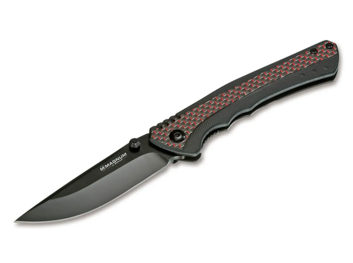 Das Magnum Rubico Verbindet Eine Klassische Funktionsweise Mit Modernen Materialien. Die Schwarz Beschichtete Klinge Aus 440A Wird Per Daumenpin Geoffnet Und Durch Den Stabilen Framelock Gesichert. Als Griffmaterial Kommt Eine Kombination Aus G10 Und Rot Schimmernder Kohlefaser Zum Einsatz, Die Dem Taschenmesser Eine Ganz Besondere Anmutung Verleiht. Die Geriffelte Daumenauflage Am Griffrucken Ermoglicht Kraftige Druckschnitte. Mit Clip (Tip-Down).
