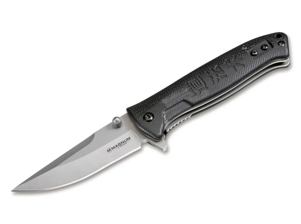 The Magnum Small But Serious Is Compact, Yet Reliable, Effective And Samurai Serious. The Backpoint Blade Of Stainless Steel 440A With Ricasso Is Rather Light And Can Be Opened With Spring Support At An Impressive Speed. The Blade Is Secured With A Reliable Linerlock. A Thumbstud And Flipper Help With Opening The Blade. The Black G10 Handle Scales Sport A Milled Pattern Of Japanese Letters To Ensure A Secure Grip. The Tip-Up Clip Can Be Repositioned For Right– And Left-Handed Users.