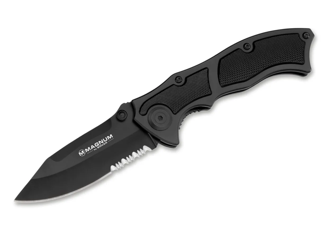 The Magnum Stout Is A Stable Heavy-Duty Tactical Folder. The Milled Aluminium Scales Provide Maximum Grip Due To The Precisely Fitted G10 Inserts. The Wide, Stable Spearpoint Blade Is Made Of 440A Stainless Steel With A Black Coating And A Partial Serrated Edge. With Clip.