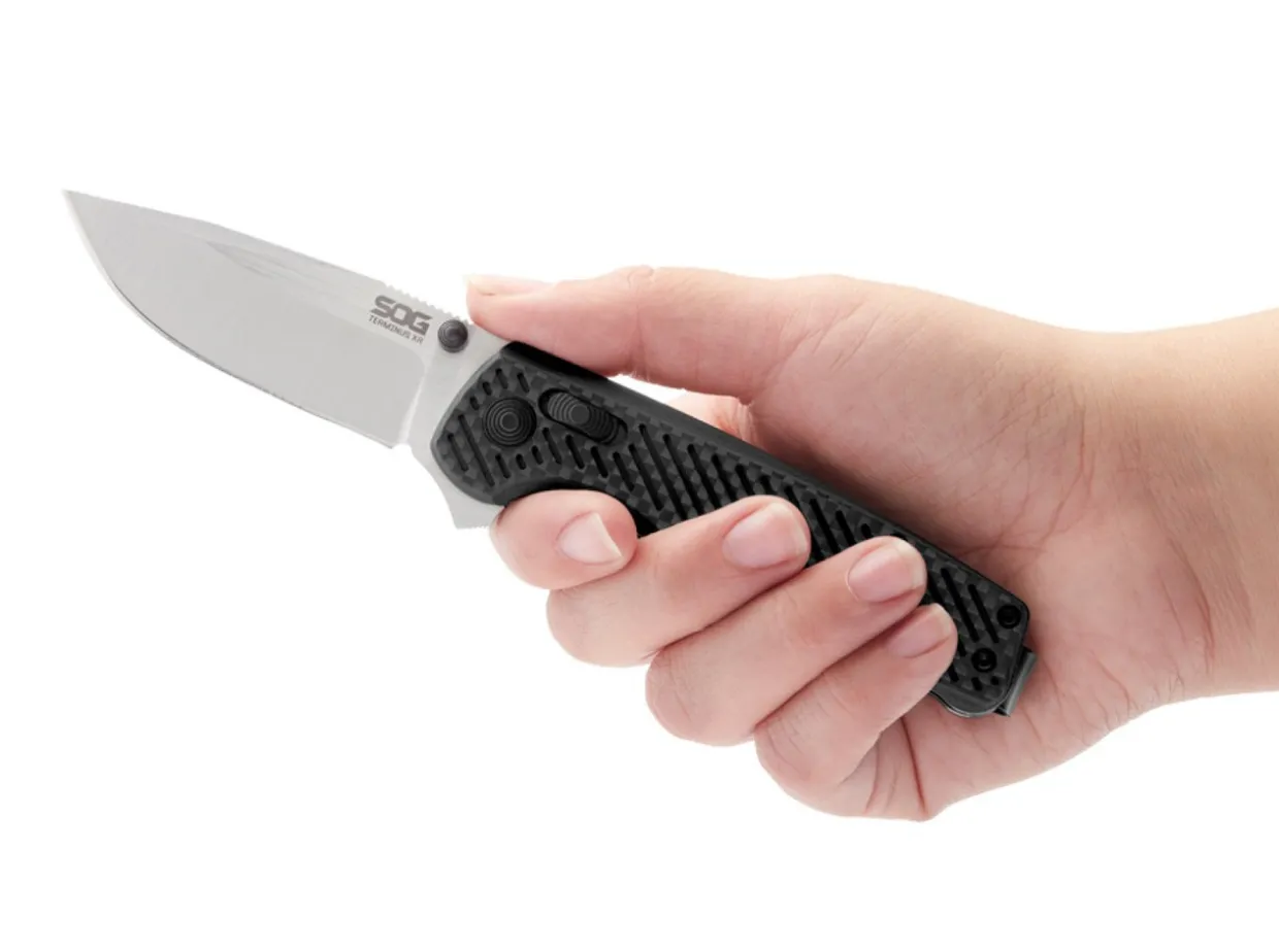 Unlike The First Version Of The Sog Terminus, The Terminus Xr Is Not A Slipjoint. The Blade Opens With A Flipper Or Thumb Stud And Locks With The Xr-Lock, Which Is Easy And Comfortable To Operate Via The Side Slide In The Handle. With The Optimised Version Bdz-1 Of The Carpenter Blade Steel Cts Bd-1, The Blade Has An Excellent Edge Retention With A Rockwell Hardness Of 60-62 Hrc. The Handle Scales Consist Of A Lightweight Laminate Of G10 And Carbon Fibre. With Reversible Deep-Carry Clip (Tip-Up/L-R).