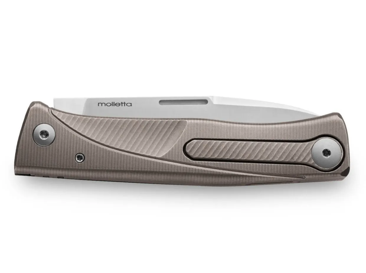 The Lionsteel Thrill Titanium Is An Ultra-Modern Slipjoint Pocket Knife With An Ergonomically Shaped Handle Milled From A Single, Solid Piece Of Bronze Titanium. The Resulting Extremely Stable Construction Also Features A Retractable Clip, The Patented Hwail System. The Satin-Finish Drop Point Blade Is Crafted From Powder-Metallurgical Bohler M390 Steel, Which Exhibits Impressive Wear And Corrosion Resistance. The Spring Tip Of The Handle Is Reinforced With A Treated Stainless Steel Insert. The Reliable Ikbs Ball Bearing System Allows For Ultra-Smooth Deployment Of The Blade That Opens With A Nail Nick. With Detachable, Retractable Clip (Tip-Up).