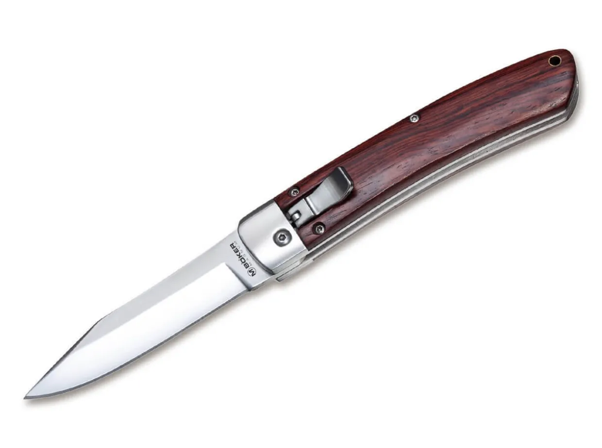 The Magnum Automatic Classic Is A Genuine Piece Of Contemporary History. The Automatic Knife Compels With Character And Charisma. The Spring-Supported, Matte Polished 440A Steel Blade Is Opened Automatically By Actuating The Trigger. Beautifully Grained Rosewood Was Chosen For The Scales. A Knife That Should Not Be Missing In Any Collection, And Will Attract Looks Of Envy During Leisure Or Professional Activities.