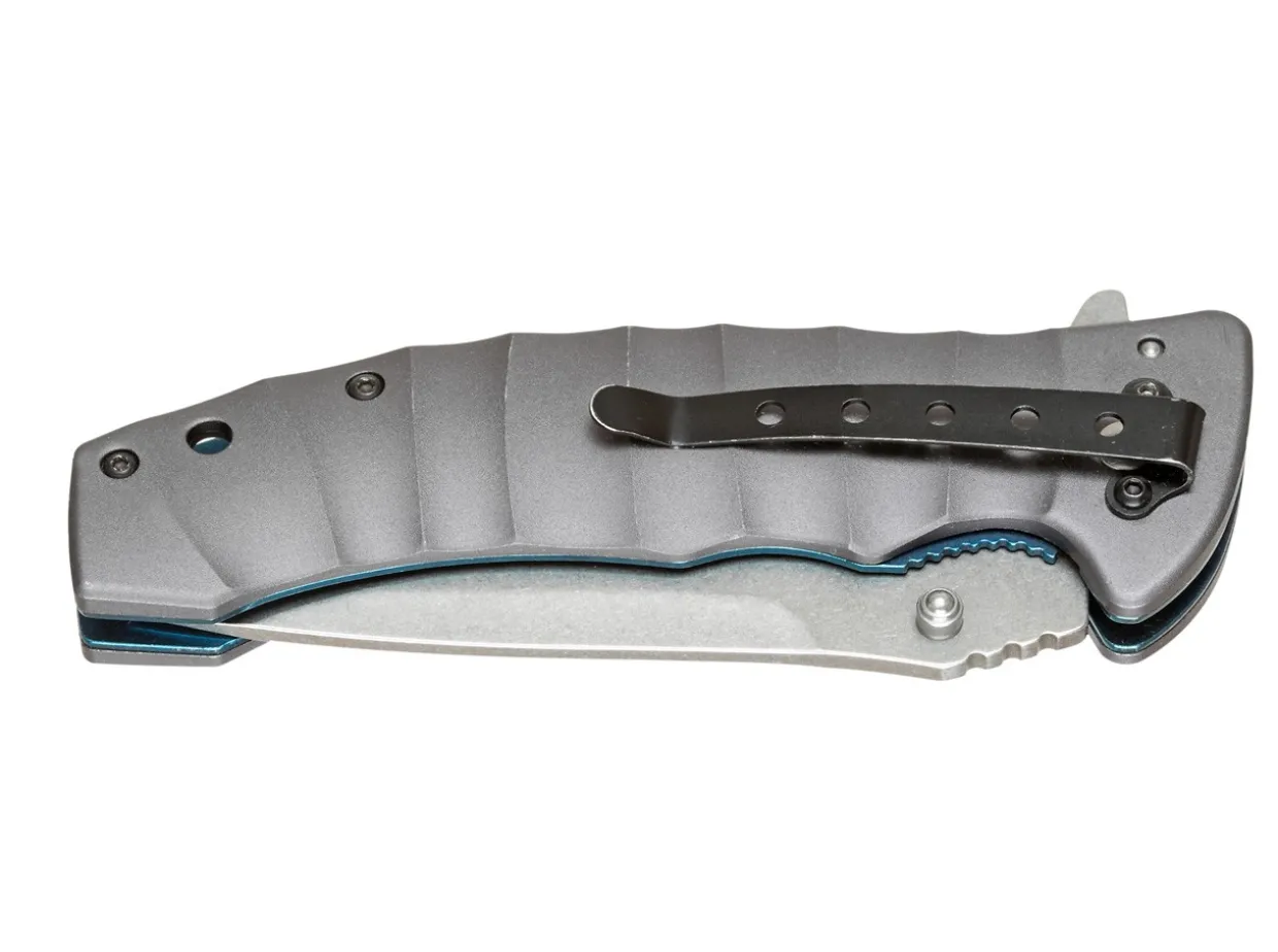 This Fully Grown Knife Impresses With Its Subtle Design And Great Functionality, Ensured In Part By The Versatile 440A Steel Blade With Stonewash Finish. The Wide And Strong Blade Opens Per Thumb Pin Or Flipper. Liner Lock With Blue Stainless Steel Plate. The Grey, Light Aluminum Scales Feel Pleasant In Your Hand. With Clip And Lanyard Hole.