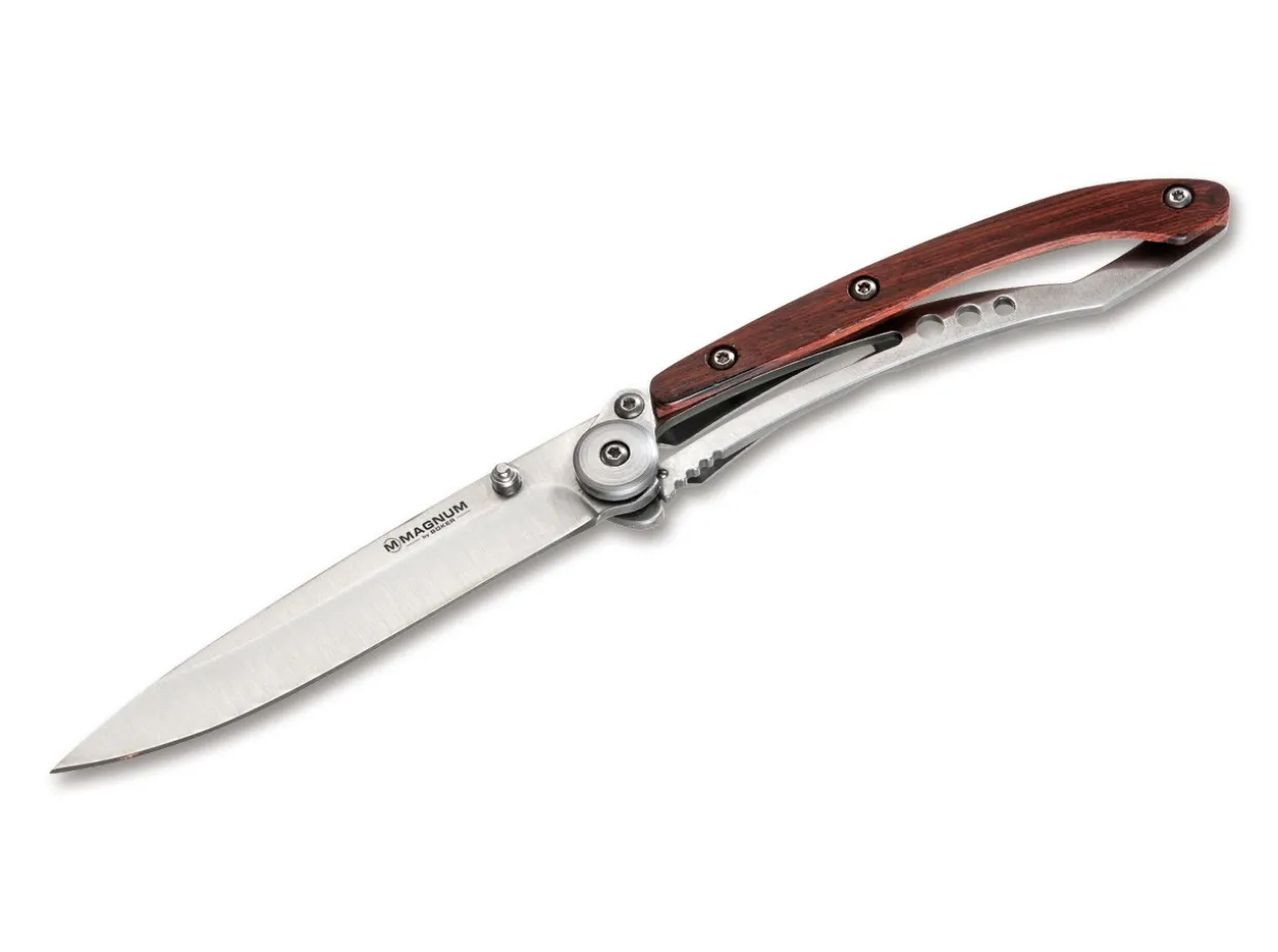 With The Magnum Dejavu, We Managed To Take The Almost 30-Year-Old Pioneering Invention Of The One-Piece Self-Supporting Framelock And Make It Even Better. In The Original Construction, The Handle And Lock Consist Of A Single V-Shaped Spring. The Handle And Blade Are Just Connected On One Side – A Relatively Weak Connection. For The Dejavu Knives, A Spacer With A Screw Was Placed Right Next To The Blade Shaft. Both Hold A Small Counter-Plate. Thus, The Blade Shaft Is Connected On Both Sides, Just Like A Regular Folder, Which Distributes The Load Symmetrically. This Makes The Knife Much More Stable Without Compromising The Clean And Slender Character Of This Design. Handle Scales Consist Of Classic Cocobolo. The Knife Can Be Opened One-Handed.