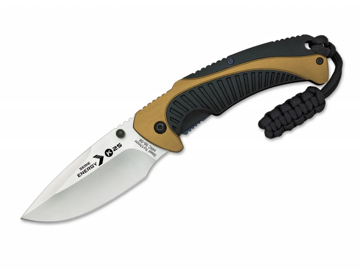 The K25 Energy Desert Compels With Its Outstanding Value For Money. The 7Cr17Mov Blade With A Hardness Of 56-58 Hrc Provides High Edge-Holding Properties. The Handle Is Made From Light-Weight Aluminum And Features A Black Plastic Inlay That Increases Grip. The Liner Lock Secures The Blade. Shipped With Lanyard Hole, Lanyard, And A Nylon Belt Pouch.
