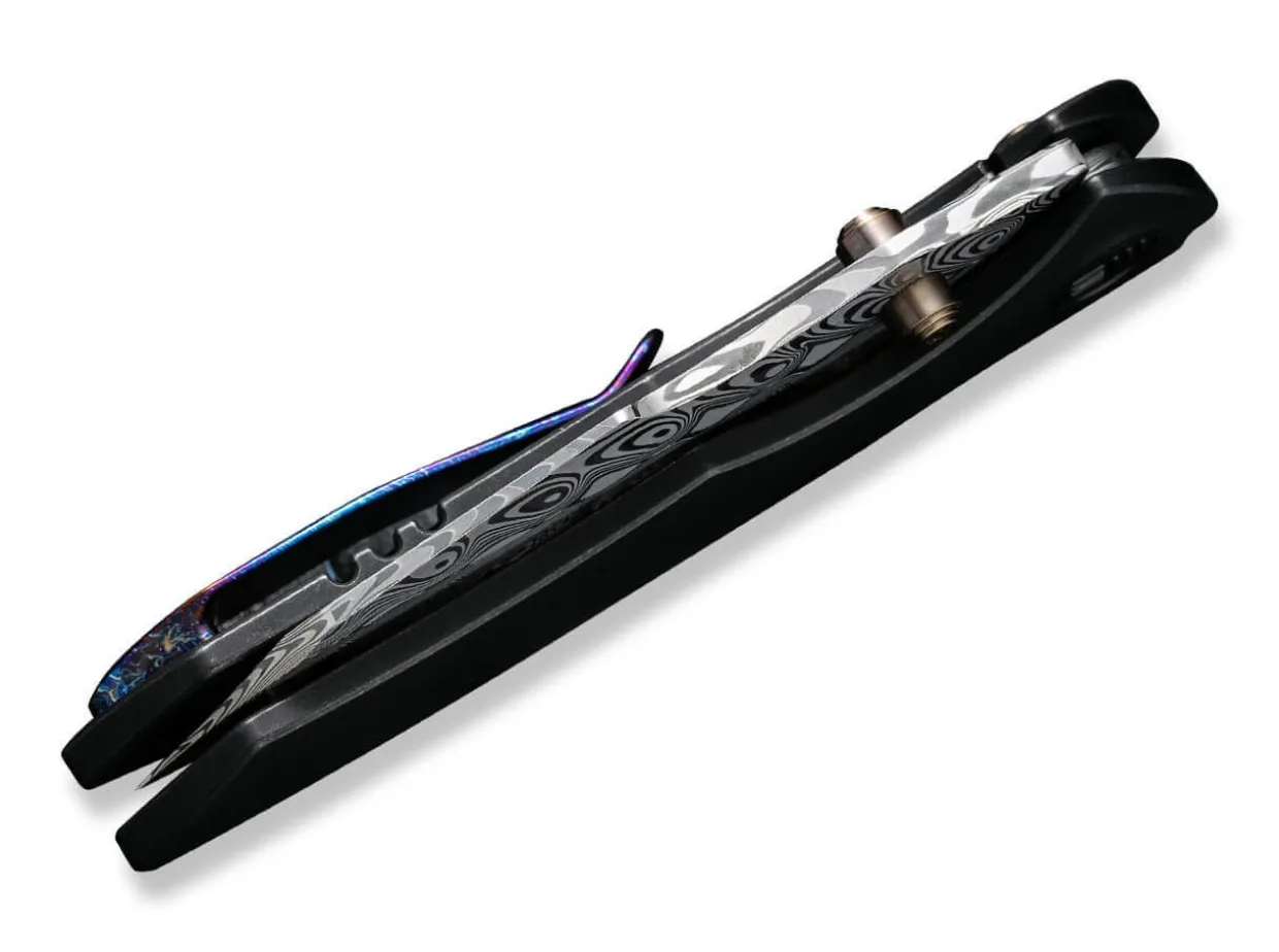 Perfect And Strikingly Unique, The We Knife High-Fin Stands Out From The Crowd And Impresses With Its Angular Design And High-Quality Materials. The Hakkapella Damascus Blade Is A Mixture Of Reverse Tanto And Harpoon And Is Reminiscent Of The Raised Dorsal Fins Of Various Fish Species. The Knife Glides Through Daily Cutting Tasks As Precisely As A Fish Through Water. The Dynamic Handle Made Of Black Titanium Lies Securely In The Hand At All Times And Houses The Reliable Frame Lock. The Bronze-Colored Screws As Well As The Thumb Stud Provide A Successful Accentuation. With Colorful Tip-Up(R) Clip.