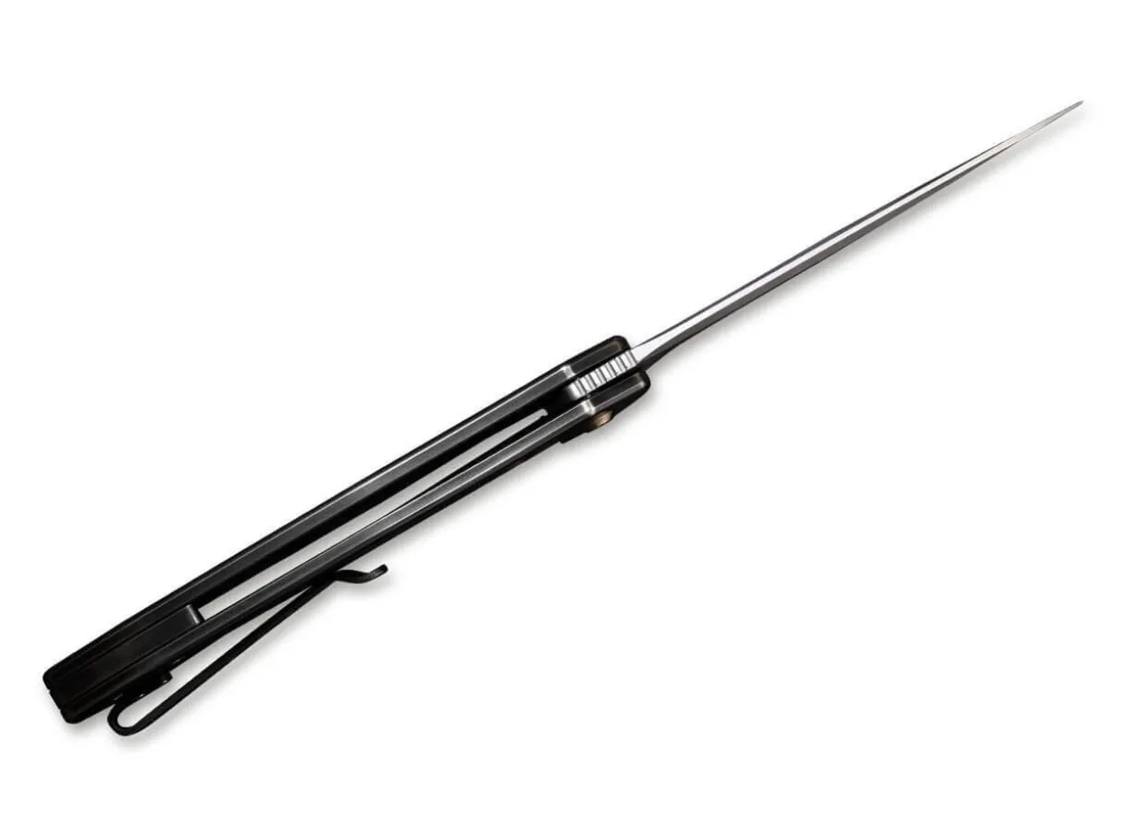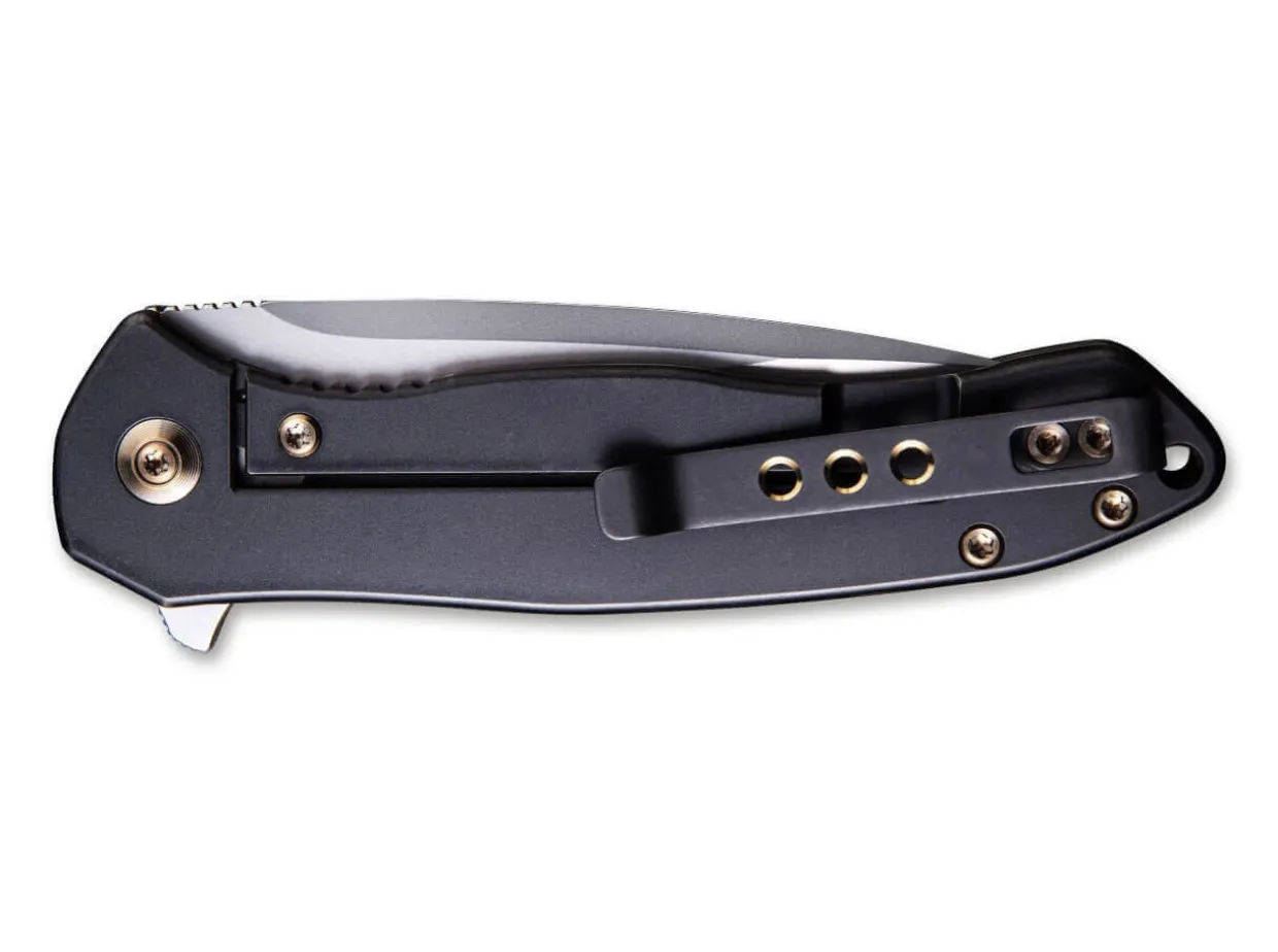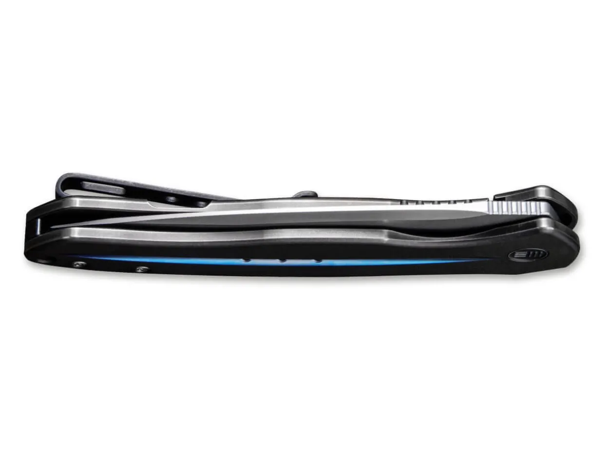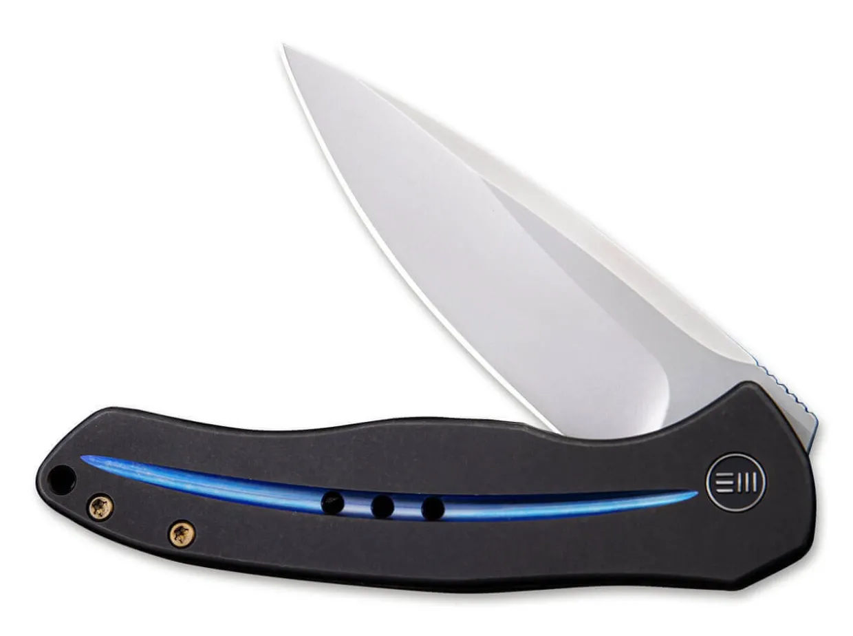 Das We Knife Kitefin Ist Ein Mittelgroses, Universell Einsetzbares Edc Messer Mit Einer Breiten Droppoint-Klinge Aus S35Vn, Die Eine Groszugige Fingermulde Fur Detailschnitte Beherbergt. Der Flipper Sorgt Fur Sanftes Offnen Der Kugelgelagerten Klinge Und Dient Zugleich Als Fingerschutz. Ein Solides Framelock Halt Die Klinge Fest In Ihrer Position Und Ermoglicht Somit Sicheres Arbeiten. Die Kitefin Messerserie Ist In Unterschiedlichen Grifffarben Und –Stilen Erhaltlich. Diese Version Ist Mit Formschonen Schwarzen Griffschalen Aus Titan Ausgestattet. Eine Mittig Gefraste Blaue Rinne Sowie Goldfarbene Schrauben Setzen Ausergewohnliche Farbliche Akzente. Mit Fangriemenose Und Umsetzbarem Deep-Carry-Clip (Tip-Up).
