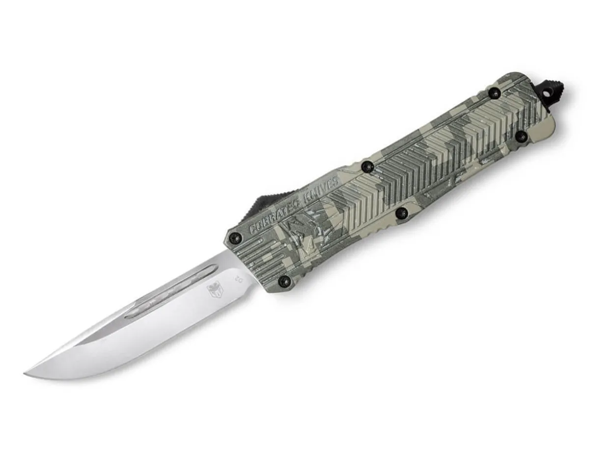 The Full-Grown Version Of The Popular Ctk-1 Convinces With A Solid D2 Drop Point Blade That Comes Out Of The Front Handle As Fast As An Arrow At The Push Of A Button And Disappears There Again When Pressed Again. The Otf (Out The Front) Knife Features A Textured Handle Made Of High-Strength Aluminum That Comes In A Green Camo Pattern. The Deep-Carry Clip Is Attached To The Glass Breaker And Allows For Tip-Up Carry On Both Sides. Supplied With High Quality Nylon Pouch.