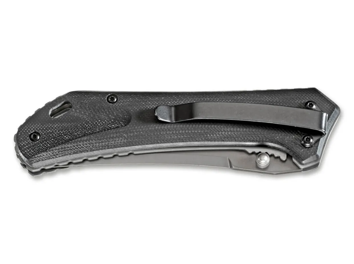 Die Geschwungene Klinge Des Handlichen Magnum Nero Erinnert Leicht An Die Form Eines Persischen Dolches. Sie Wird Aus 440A Gefertigt Und Ist Mit Einer Grauen Beschichtung Versehen. Die Offnung Erfolgt Federunterstutzt Per Beidseitigem Daumenpin, Die Verriegelung Ubernimmt Ein Linerlock. Die Rutschfesten Schwarzen Griffschalen Bestehen Aus Strukturiertem G10, Das Auch Bei Schlechten Witterungsbedingungen Sicher In Der Hand Liegt. Mit Clip (Tip-Down) Und Fangriemenose.
