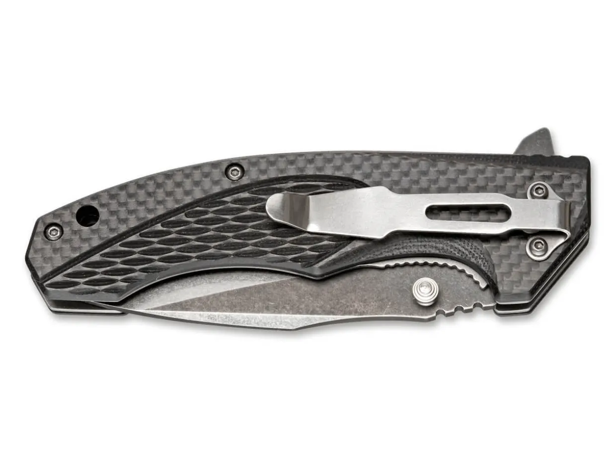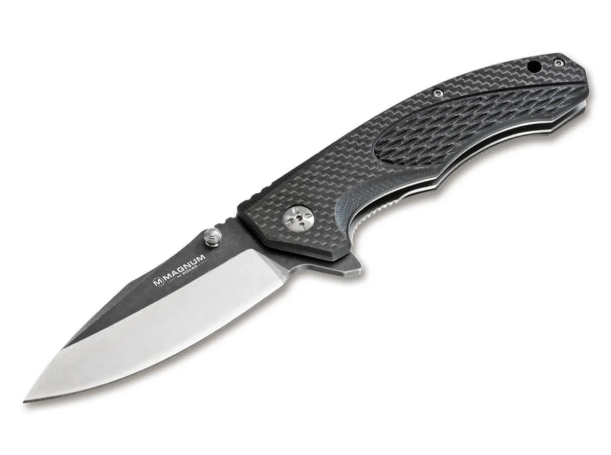 The Black Handle And Dark Blade Give The Magnum Omen A Suitably Tactical Look. The 440A Blade Has A Stonewash Finish And Can Be Opened With The Flipper Or Double-Sided Thumbstud. A Sturdy Linerlock Secures The Blade. The Handle Scales Consist Of Carbon Fiber With Textured Surfaces For An Extra Secure Grip. A Fluted Thumb Rest Adds Cutting Stability And Safety. With A Clip (Tip-Down).