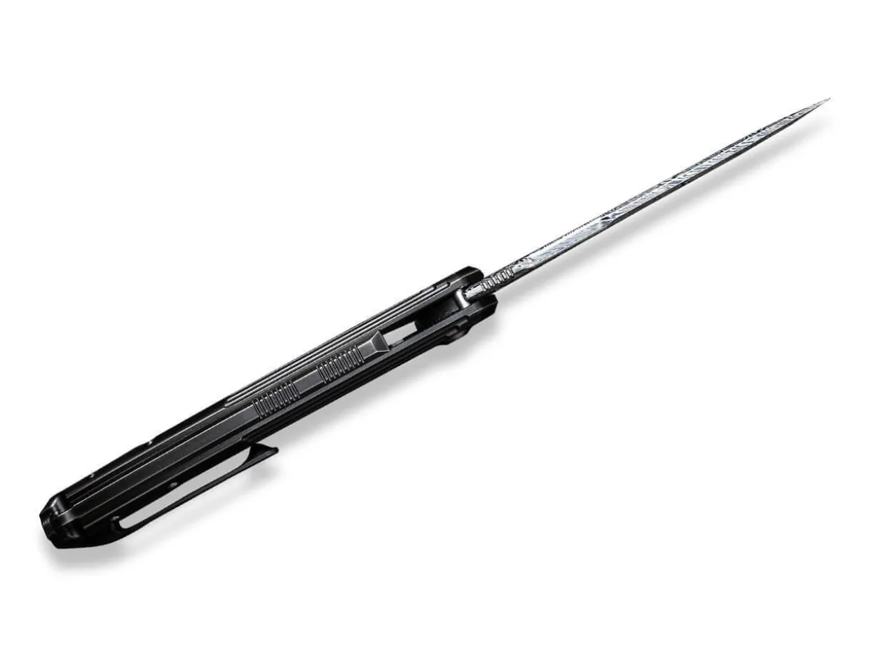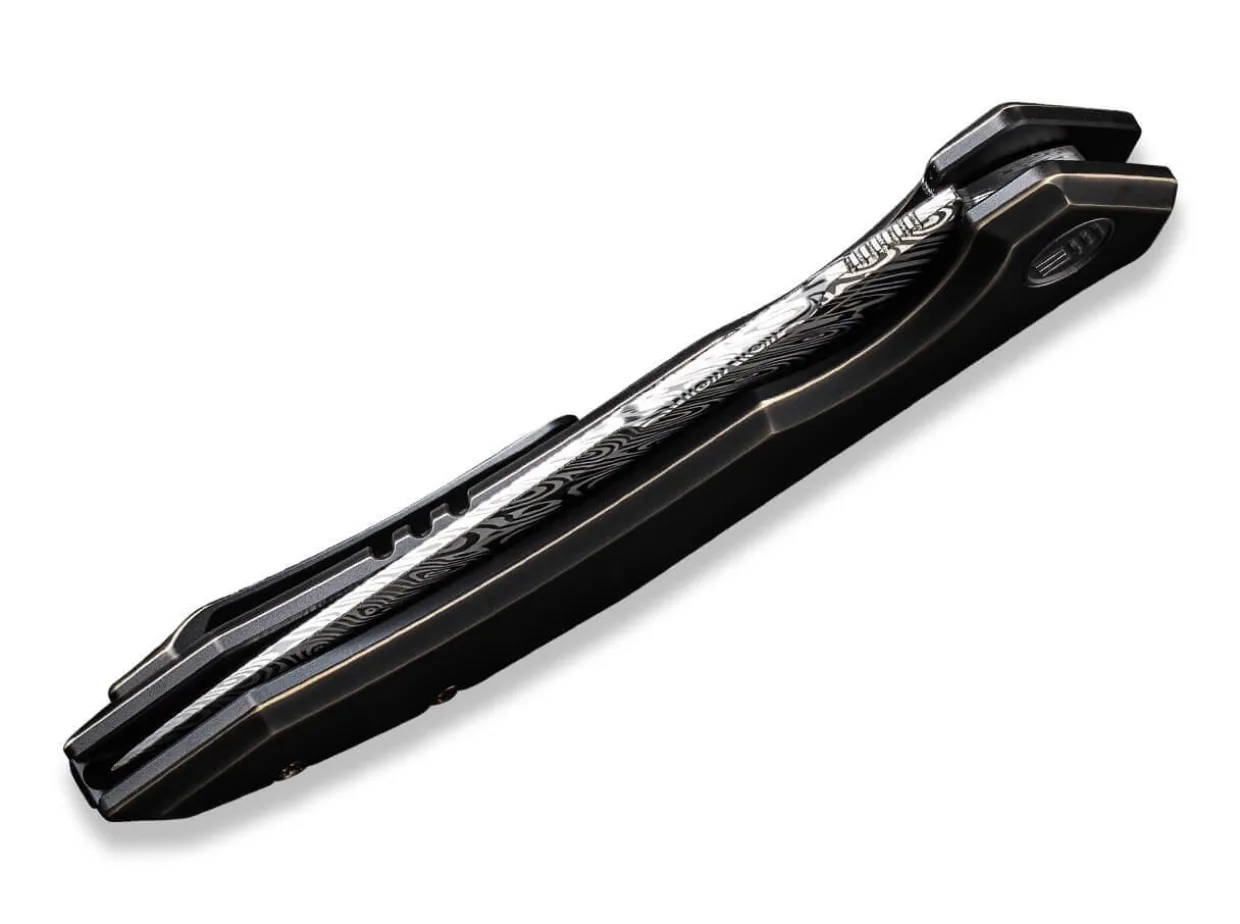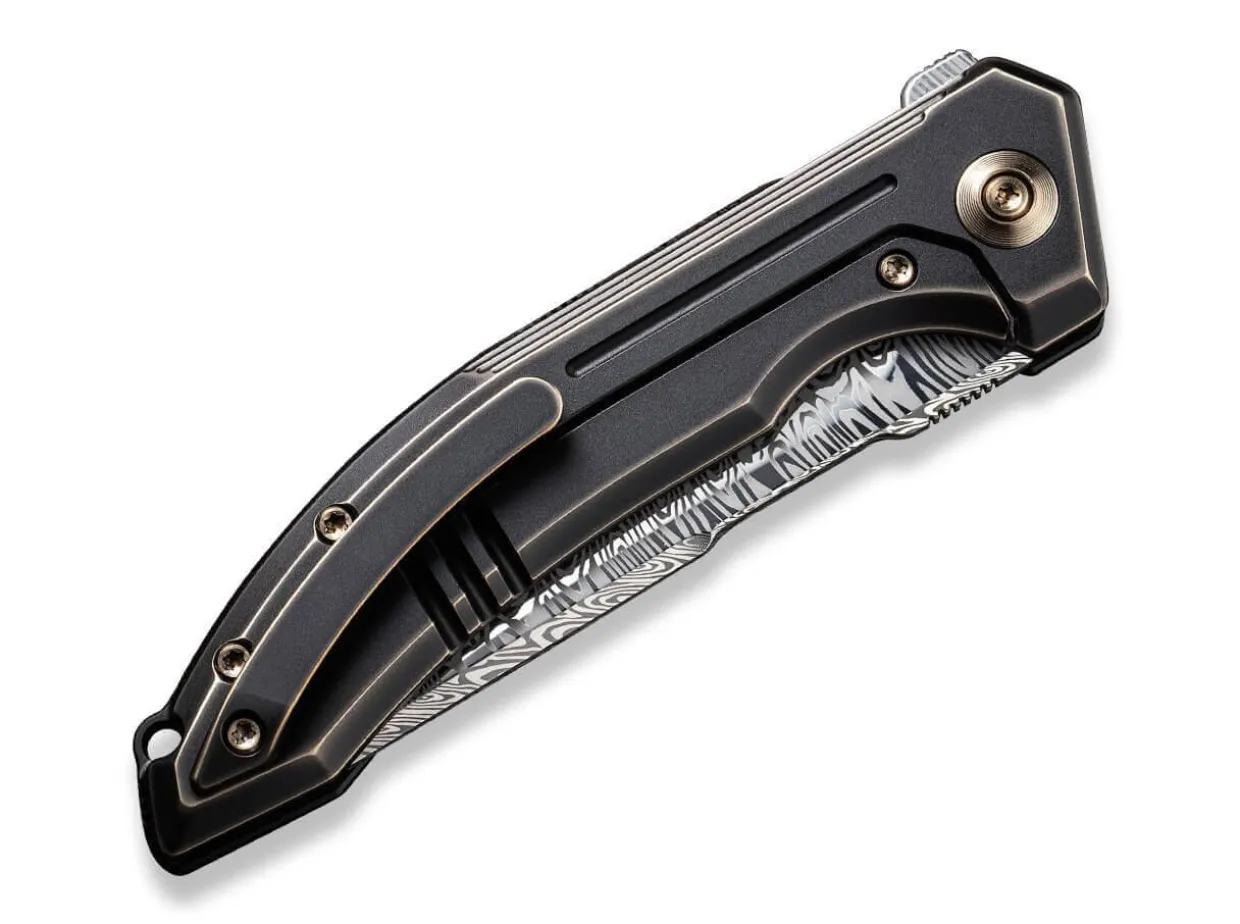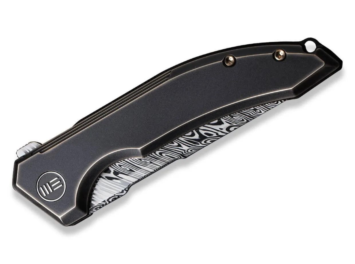 The We Knife Quixotic Is The Idealist Among Edc Knives. As Proof, The Framelock Folder Cites The Mythical Heimskringla Damascus Blade As Well As The Bronze Mottled Handle Made Of Black Titanium, Which Make Everyday Cutting Tasks A Breeze. The Distinctive Ricasso And The Grooves On The Back Of The Blade Set Visual Accents, While The Clip (Tip-Up/R) And The Lanyard Loop Round Off The Knife Functionally.
