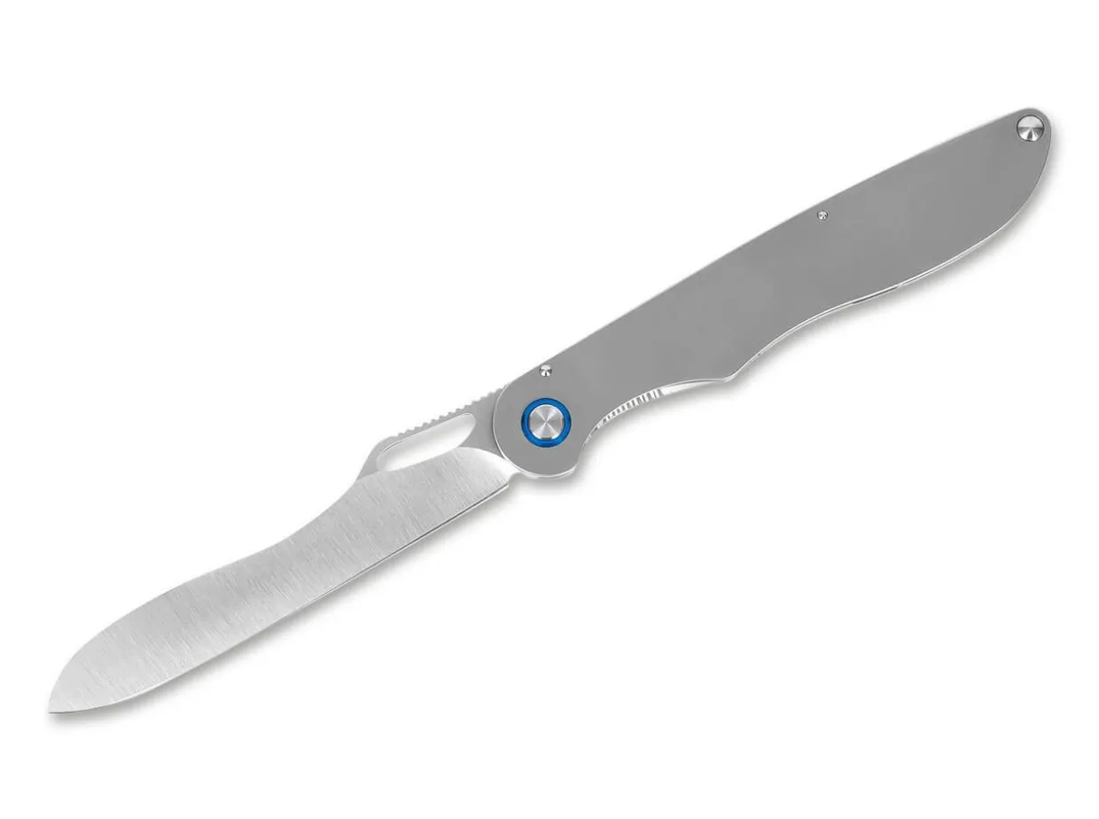 With The Real Steel Realslim, The Name Says It All. The Extremely Flat Edc Pocket Knife With Vg-10 Blade And Stainless Steel Handle Was Designed By Helmut Jermer And Weighs Just 56 Grams. The Realslim Picks Up On Elements Of Classic French Knives And Impresses With An Ergonomic Handle That Also Enables Safe Working. The Blue Ring Around The Decorative Blade Axle Screw And The Blue Spacer Add A Special Colour Accent. The Curved Drop Point Blade Opens With A Generous Thumb Hole And Is Secured With A Framelock. With A Clip (Tip-Up/R) And A Lanyard Hole.