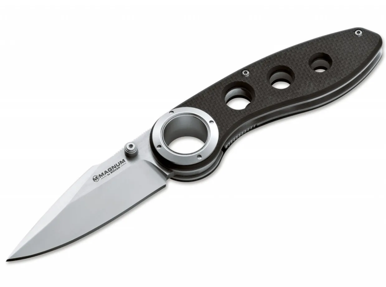 Due To Its Special Construction Of The Blade Bearing, The Magnum Ring-O Has A Very Individual Appearance. The Strong 440A Stainless Steel Blade Rotates Around The Extremely Stable Bearing And Is Securely Locked By The Liner Lock Mechanism. The Excellent Grip Is Guaranteed By The Stainless Steel Plates And The G10 Handle. Includes Pocket Clip.