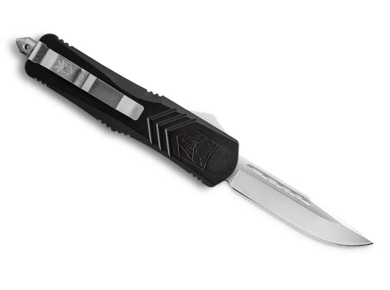 The Compact Cobratec Small Fs-X Otf Black Convinces With Its Blade Made Of D2 And The Non-Slip Handle Made Of Aluminium. The Blade Automatically Comes Out Of The Front Handle (Out The Front) At The Push Of A Button. With Nylon Case, Glass Breaker And Clip (Tip-Down/R).