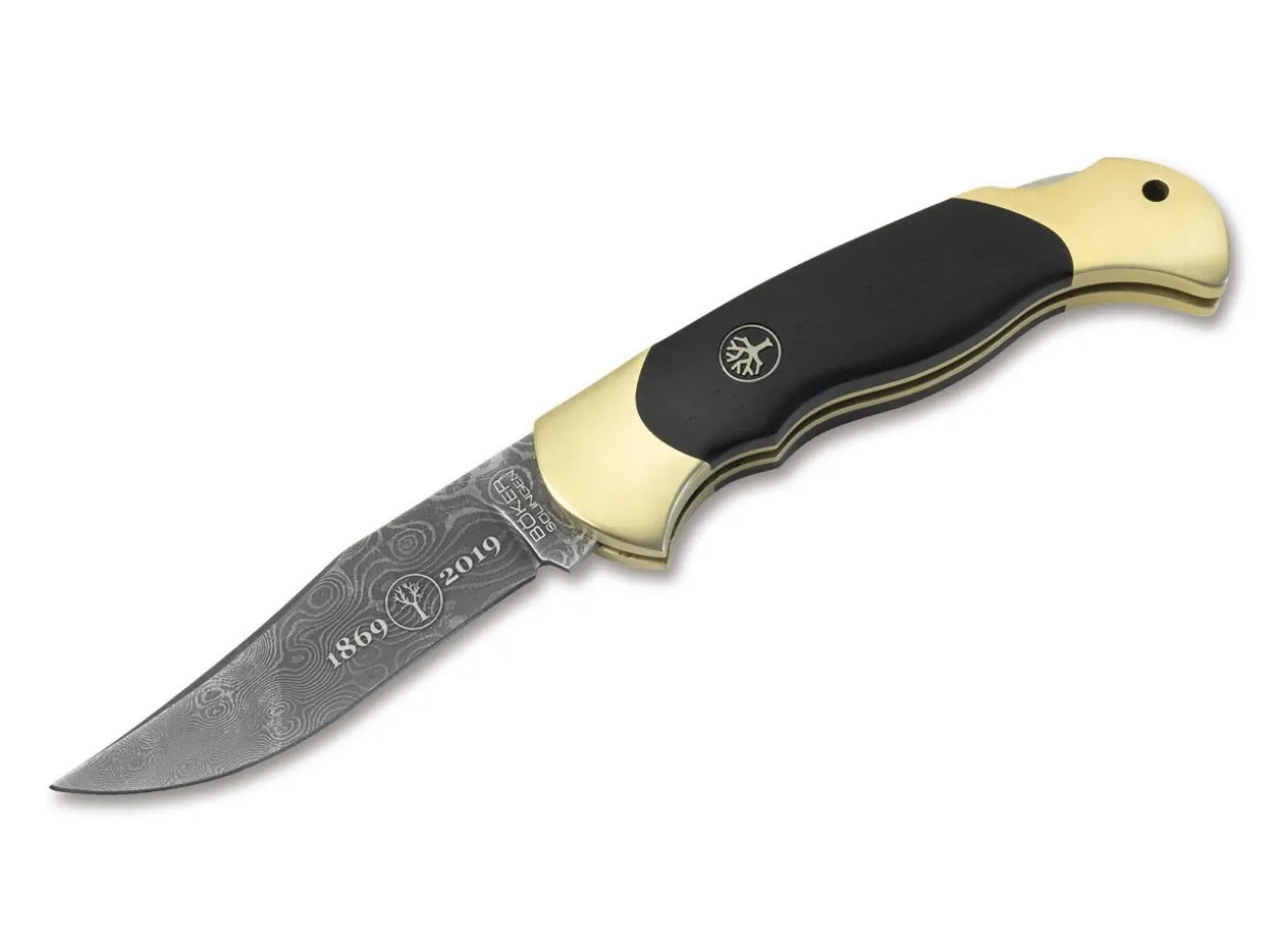 The Boker Scout Has Been Firmly Connected With Our Name Since 1985 And Has Been Convincing In Hunting, In The Wilderness And In Everyday Life For Generations. The Characteristic Blade Of This Special Run Edition, Limited To Only 8 Pieces Worldwide, Is Made Of Our Unique Steam Engine Damascus. The Blade Is Locked By A Reliable Backlock. The Extremely Sturdy Brass Body Is Cnc-Milled And Then Finely Ground By Hand. The Handle Scales Are Made Of Dark Ebony. Handmade In The Boker Knife Manufactory Solingen.