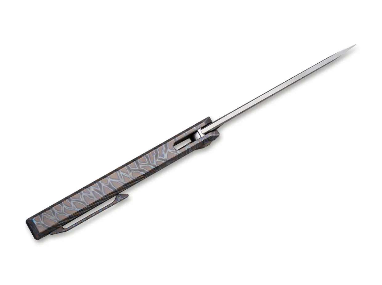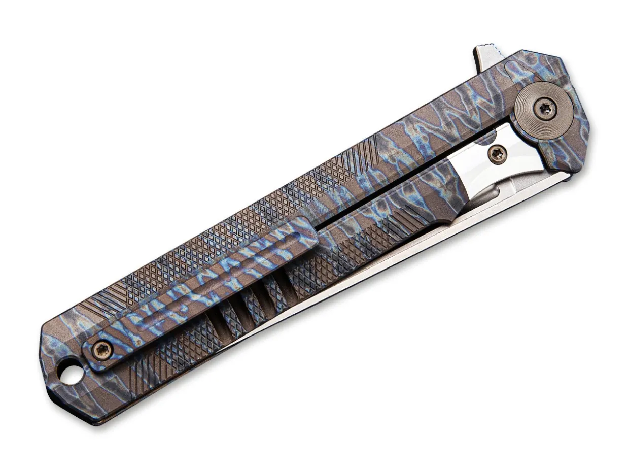 The Sophisticated Syncro By We Knife Features A Monoblock Flamed Titanium Handle, Which Is Not Constructed From Two Halves But Milled Out Of A Solid Block Of Titanium, Including The Framelock Mechanism. The Slimline Construction Is Reminiscent Of Japanese Designs. The Powder-Metallurgical Blade Of This Exceptional Knife Opens With A Flipper. The Pivot Cap, Clip (Tip-Up) And Screws Are Also Made Of Titanium.