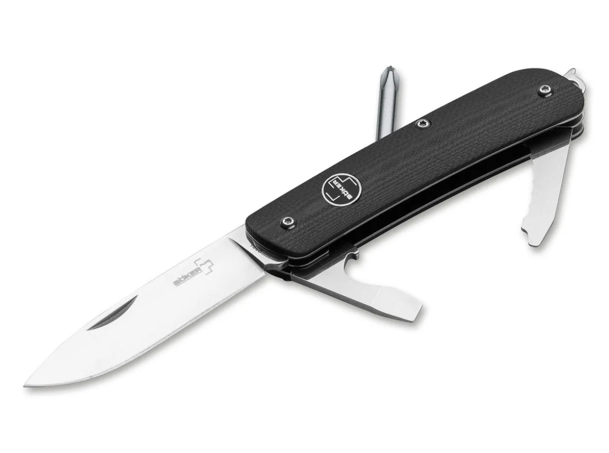 With The Boker Camp Knife, One Of The Forefathers Of All Modern Multi-Purpose Pocket Knives, Our History Began In The Year 1869. After Almost 150 Years Of Successful Market Presence, The Time Came To Convert This Proven Concept Into A Modern Knife.The Modernized Construction, Which Is Based On Solid Steel Liners, Is Embedded In Two Contoured Handle Scales, Made Out Of Black G10. The Swedish Sandvik 12C27 Steel, With A Rockwell Hardness Of 58-60 Hrc, Provides Outstanding Edge Retention Of The Hollow Ground Blade. The High Quality Manufacturing, With A Smooth Blade Action And Optimized Operability, Are Proof Of The Premium Quality Of Our Boker Plus Tech Tools. The Hollow Ground Stainless Steel Blade Is Accompanied By These Tools: Glass Breaker, Flat Screwdriver With Cap Lifter And Wire Stripper, Small Serrated Blade With Flat Screwdriver, Screwdriver, Lanyard Hole, Clip.