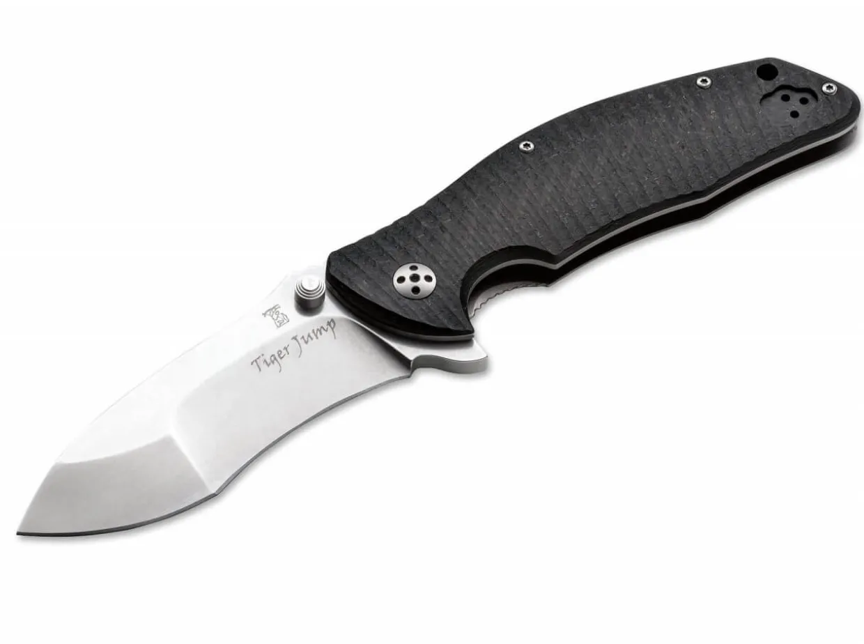 The Tiger Jump Also Carries The Unmistakable Handwriting Of Lionsteel. The Team From Maniago Executed The Design By T. Antonevich In The Customary Squeaky Clean Quality. The Blade Is Deployed With The Flipper, While The Titanium Rear Handle Scale Houses The Frame Lock With The Additional Rotoblock Safety, Which Ensures Extreme Handling Safety. The Carbon Fiber Front Scale Is Secured To A Titanium Liner And Provides Optimum Grip Due To Its Milled Texture. D2 Blade With Stonewash Finish. Adjustable Clip (L/R). Solid, Strong, Yet Dynamic And In No Way Bulky – A More Than Successful Design. Shipped With Dendra Special-Purpose Wrench To Adjust Blade Tension.